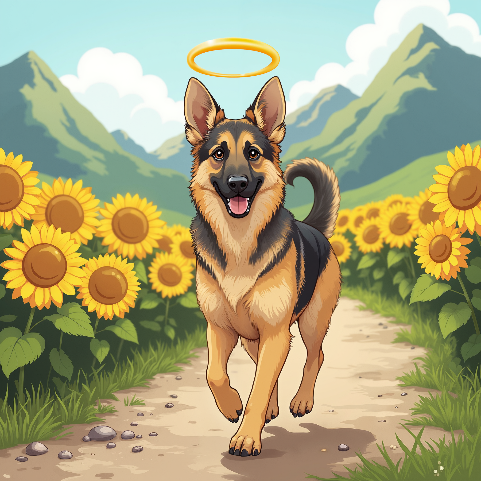 This design features your pet joyfully running down a sunflower-lined path under glowing skies, with a soft halo above their head reminding us that while they may be gone, their light lives on in every golden bloom.